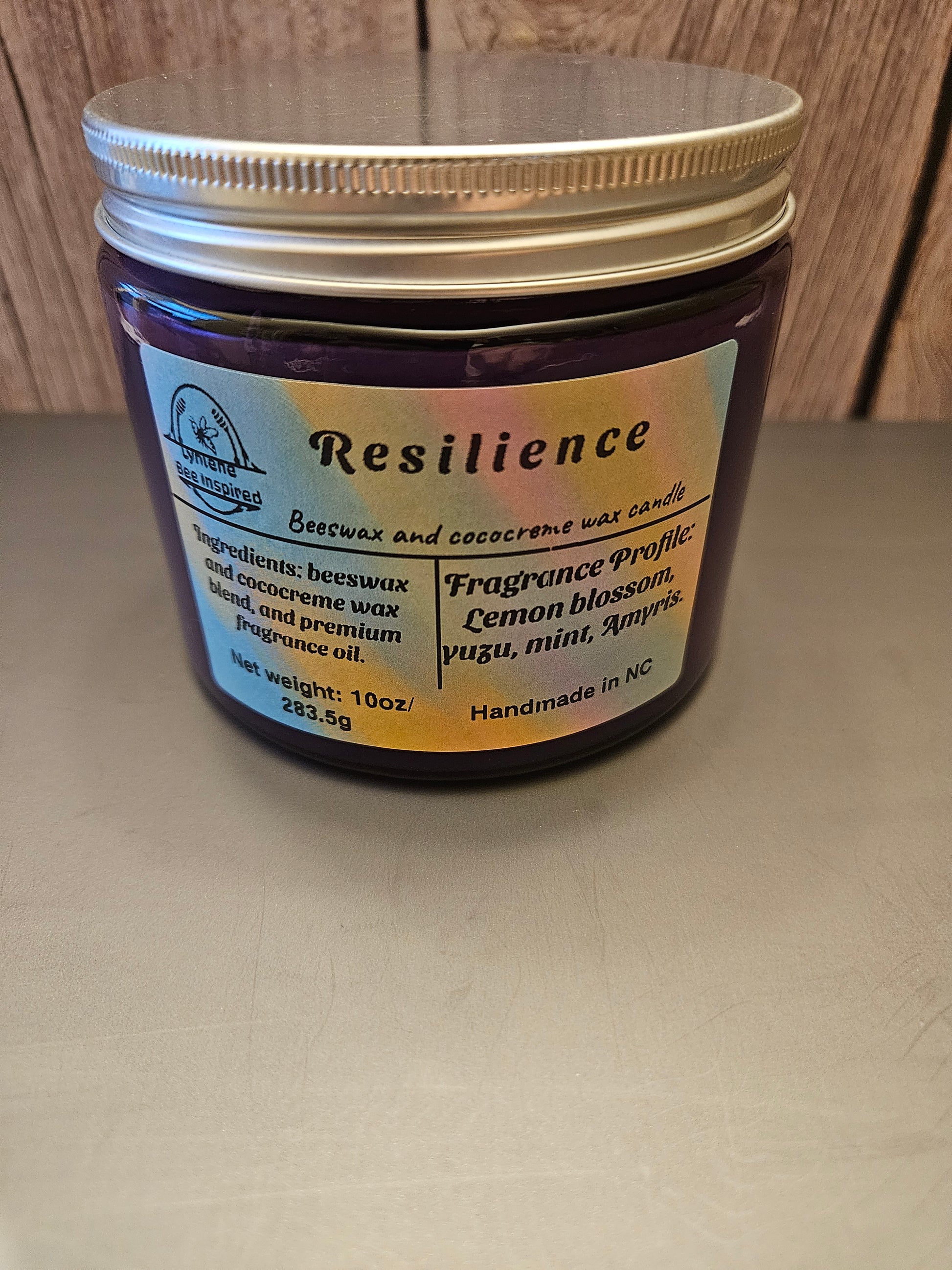 Beeswax and cococreme wax blend scented candle with a wood wick and premium fragrance oil. Presented in a 12oz glass jar with a silver lid.